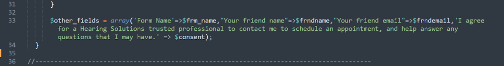 $other_fields = array(‘Form Name’=>$frm_name,”Postal code”=>$postal_code);
