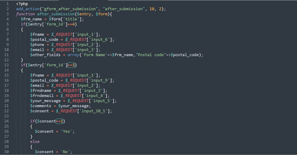 Then declare after_submission just below of that. We need to pass the $entry and $form variables along with a function to access form submission contents.
