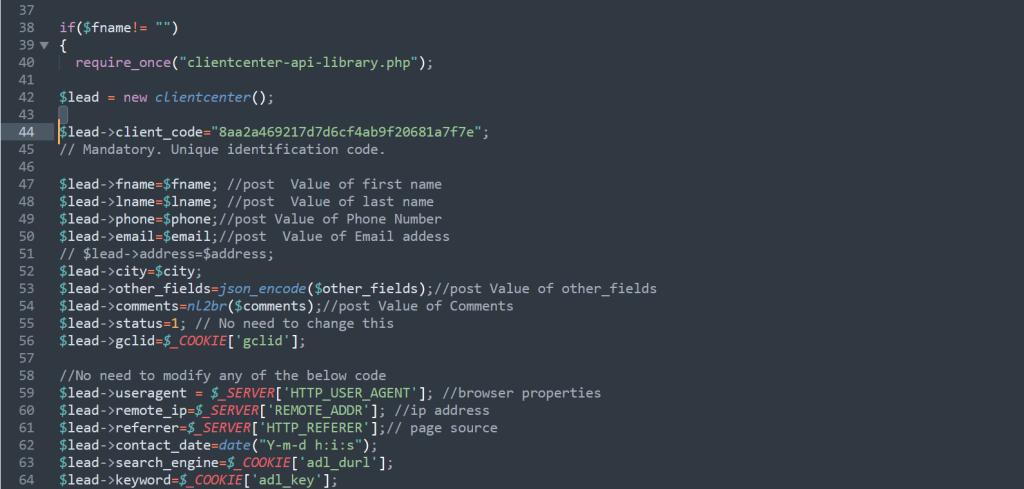 $lead->client_code=”8aa2a469217d7d6cf4ab9f20681a7f7e”;